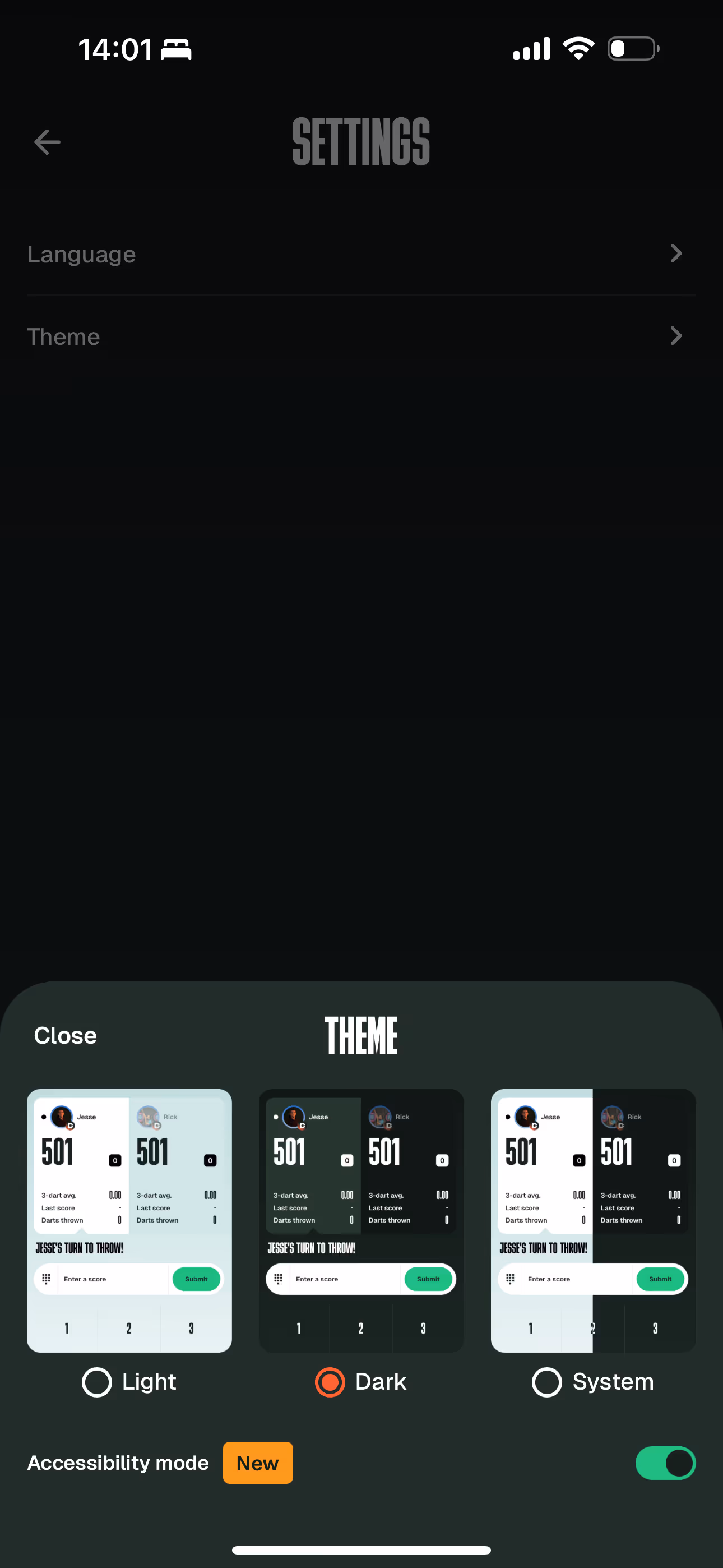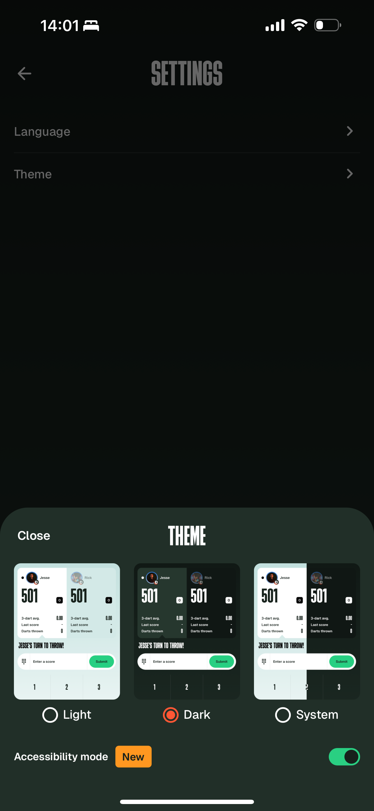 Switch between Dart or Light mode, then flip Accessibility Mode on.