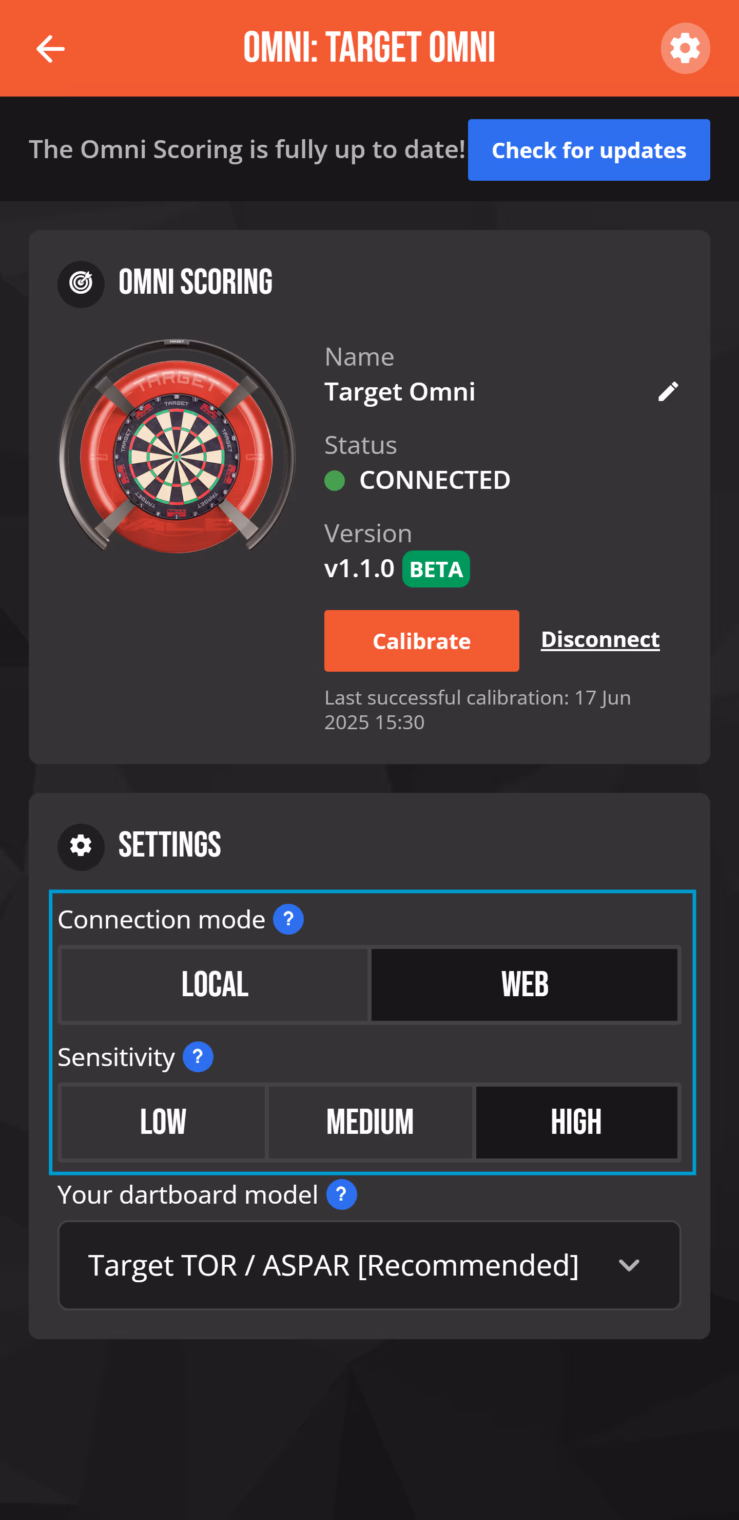 We've also added a new Sensitivity setting. By default, it's set to HIGH, which is recommended for most environments. However, if you experience phantom dart detections — often caused by strong external lighting or reflections — lowering the sensitivity might improve accuracy.